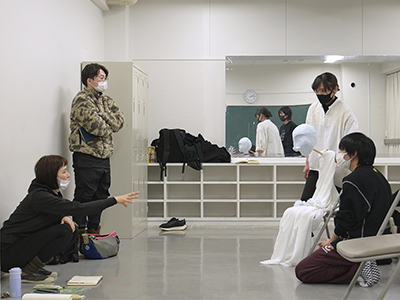 佐次 不条理演劇で有名な劇作家、イヨネスコの「椅子」という作品で、椅子がものすごくたくさん出てくる、簡単にいえばそういう作品です。今回は、不条理演劇というものを、とても具体的にやってみようと考えています。多分一番大きなポイントは人形だと思うんですが、人形操作と身体表現を混ぜながら、なおかつ、生演奏と映像を組み合わせて、駆使して作品を作っていくという、ノンジャンルの作品になっています。イヨネスコ戯曲はセリフとト書きの中に、リズムやテンポなどが全部書かれていて、それを忠実に具現化していくという面白さがありますね。そして、そこをしっかり通っていくと、歯車が回り出すんです。それが非常に面白いなと思っています。